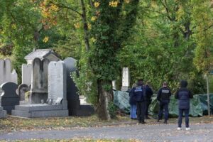 Police officers work at Bagneux cemetery after the grave of former French justice minister Robert Badinter was vandalised on the day of his induction into the Pantheon, in Bagneux, near Paris, France, October 9, 2025. REUTERS/Gonzalo Fuentes