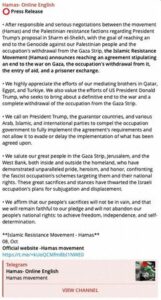 A statement by Hamas on Telegram announcing it had reached an agreement to end the war in Gaza following talks on a proposal by U.S. President Donald Trump, saying the deal includes an Israeli withdrawal from the enclave and a hostage-prisoner exchange, in this screenshot released October 9, 2025. Social Media Website/Handout via REUTERS