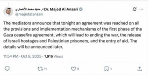 A post by Qatar’s foreign ministry spokesperson, Majed Al-Ansari, following U.S. President Donald Trump’s announcement that a deal had been reached between Israel and Hamas to end the two-year war in Gaza, in this screenshot taken from a social media website released October 8, 2025. Social Media Website/Handout via REUTERS