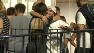 People react to news that Israel and Hamas have agreed on Wednesday to the first phase of U.S. President Donald Trump’s plan for Gaza, at Hostages Square in Tel Aviv, Israel, October 9, 2025, in this still image taken from video. Reuters TV via REUTERS