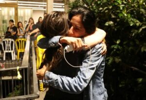 Einav Zangauker, the mother of hostage Matan Zangauker, reacts, after U.S. President Donald Trump announced that Israel and Hamas agreed on the first phase of a Gaza ceasefire, at the “Hostages square”, in Tel Aviv, Israel, October 9, 2025. REUTERS/Ronen Zvulun