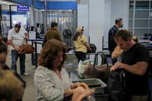 FOTO DE ARCHIVO. Viajeros pasan por un control de seguridad de la Administración de Seguridad en el Transporte (TSA) en el aeropuerto de Hollywood Burbank durante el primer día del cierre parcial del gobierno estadounidense en Burbank, California, Estados Unidos. 1 de octubre de 2025. REUTERS/Daniel Cole