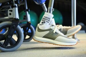 ARCHIV: Eine Beinprothese mit Socken und Schuhen eines ukrainischen Patienten wird beim Prothesenhersteller Ottobock in Duderstadt, Deutschland, am 4. April 2023 gezeigt. REUTERS/Annegret Hilse/File Photo