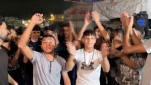 Palestinos celebran la noticia de que Israel y Hamás han acordado el miércoles la primera fase del plan del presidente de Estados Unidos, Donald Trump, para Gaza, en Jan Yunis, en el sur de la Franja de Gaza, en esta captura de pantalla obtenida de un vídeo publicado el 9 de octubre de 2025. Vídeo obtenido por REUTERS
