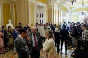 U.S. Senate Minority Leader Chuck Schumer (D-NY) speaks with aides following the Democratic leaders’ weekly policy lunch as the partial government shutdown continues, on Capitol Hill in Washington, D.C., U.S., October 7, 2025. REUTERS/Kent Nishimura
