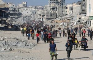 Palestinos caminan entre los escombros tras la retirada de las fuerzas israelíes de la zona de Jan Yunis, al sur de la Franja de Gaza, el sábado. Foto: Ramadan Abd – Reuters