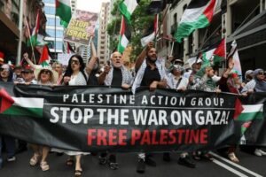 Demonstrators hold a banner during the ‘Nationwide March for Palestine’, after a ceasefire between Israel and Hamas in Gaza went into effect, in Sydney, Australia, October 12, 2025. REUTERS/Hollie Adams