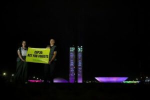 Greenpeace activists hold a sign reading “Cop 30: Act for forests”, as they project slogans onto Brazil’s National Congress to urge COP30 negotiators to protect forests and the Amazon as part of efforts to combat the climate crisis, outside Brazil’s National Congress, in Brasilia, Brazil, October 11, 2025. REUTERS/Adriano Machado TPX IMAGES OF THE DAY