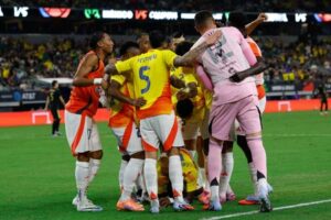 Jugadores de Colombia celebran tras anotar uno de los cuatro goles con los que vencieron a México en partido de preparación para la Copa del Mundo. Estadio AT&T, Arlington, Texas, EEUU. 11 de octubre de 2025.