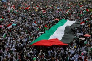 People take part in a rally supporting Palestinians in Gaza, as the conflict between Israel and Hamas continues, at the National Monument (Monas) complex in Jakarta, Indonesia, November 5, 2023. REUTERS/Willy Kurniawan