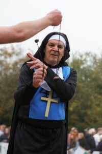 A competitor dressed as a nun swings his conker during the first round of the annual World Conker Championships in Southwick, Britain, October 12, 2025. REUTERS/Temilade Adelaja