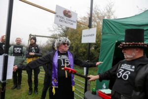 A competitor is inspected at ‘steel conker detector’ on entry at the annual World Conker Championships in Southwick, Britain October 12, 2025. REUTERS/Temilade Adelaja