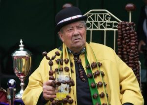 David Jakins, known as ‘King Conker’ sits during the annual World Conker Championships in Southwick, Britain, October 12, 2025. REUTERS/Temilade Adelaja