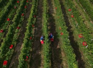 A drone view shows the family members of Yuichi Hirotsu harvest Kerner grapes at their Hirotsu Vineyard, managed by the Hirotsu family producing Pinot Noir, Kerner, Zweigelt Rebe, Bacchus and other grapes and for wines produced by Grande Polaire, in Yoichi on Japan’s northernmost island of Hokkaido, Japan October 6, 2025. REUTERS/Issei Kato