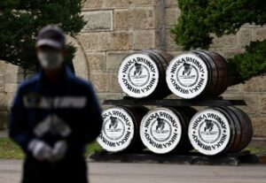 Whisky barrels with the Nikka Whisky logo are on display at Nikka Whisky Yoichi Distillery in Yoichi on Japan’s northernmost island of Hokkaido, Japan October 7, 2025. REUTERS/Issei Kato