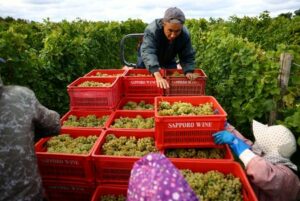 Yuichi Hirotsu, 45, and his family members harvest Kerner grapes at their Hirotsu Vineyard, managed by the Hirotsu family producing Pinot Noir, Kerner and other grapes for wine produced by Grande Polaire, in Yoichi on Japan’s northernmost island of Hokkaido, Japan October 6, 2025. REUTERS/Issei Kato