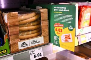 ARCHIV: Wiener Würstchen sind neben einem Preisschild abgebildet, mit Hinweis auf die europaweite “Wahre Kosten”-Aktionswoche des Discounters Penny, in der neun ausgewählte Produkte den errechneten “wahren Preis” als Verkaufspreis erhalten, unter Berücksichtigung der Umweltkosten, in Berlin, Deutschland 1. August 2023. REUTERS/Annegret Hilse