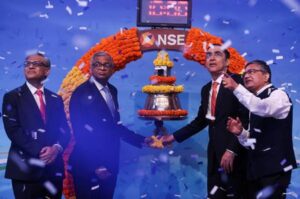 Chairman of Tata Capital Limited Saurabh Agrawal, Chairman of Tata Sons Natarajan Chandrasekaran, Managing Director (MD) and CEO of Tata Capital Limited Rajiv Sabharwal and CEO of National Stock Exchange (NSE) Ashish Chauhan attend the bell ringing ritual during the listing ceremony of Tata Capital Limited’s Initial Public Offering (IPO) at the NSE in Mumbai, India, October 13, 2025. REUTERS/Francis Mascarenhas