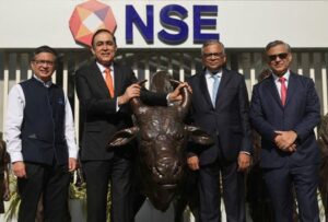 CEO of National Stock Exchange (NSE) Ashish Chauhan, Managing Director (MD) and CEO of Tata Capital Limited Rajiv Sabharwal, Chairman of Tata Sons Natarajan Chandrasekaran and Chairman of Tata Capital Limited Saurabh Agrawal pose with a statue of the NSE bull, ahead of the listing ceremony of Tata Capital Limited’s Initial Public Offering (IPO) at the NSE in Mumbai, India, October 13, 2025. REUTERS/Francis Mascarenhas