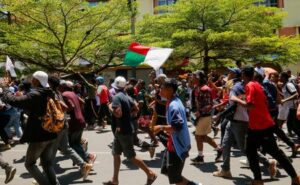 ARCHIV: Demonstrierende halten die Flagge von Madagaskar während eines Protests in Antananarivo gegen anhaltende Wasser- und Stromausfälle, 13. Oktober 2025. REUTERS/Zo Andrianjafy