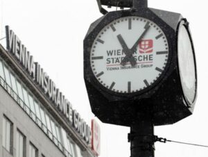 ARCHIV: Eine Uhr mit dem Logo der Vienna Insurance Group (VIG) ist vor der VIG-Zentrale zu sehen in Wien am 3. April 2013. REUTERS/Heinz-Peter Bader (ÖSTERREICH – Tags: GESCHÄFTSLOGO)