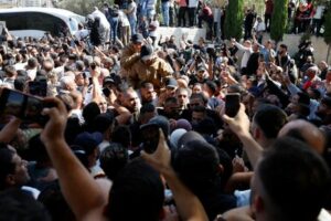 People gather to greet freed Palestinian prisoners as they arrive after being released from an Israeli jail as part of a hostages-prisoners swap and a ceasefire deal in Gaza between Hamas and Israel, in Ramallah, in the Israeli-occupied West Bank, October 13, 2025. REUTERS/Mohammed Torokman