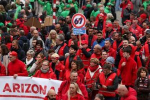 A protester holds a placard with the number “67” crossed out as people attend a demonstration during a nationwide strike against the Belgian government’s reform plans, in Brussels, Belgium, October 14, 2025. REUTERS/Omar Havana