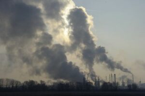Smoke and steam billow from smokestacks of factories near Chalampe