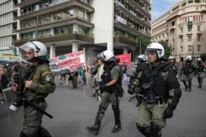Riot police officers walk by protesters, during a one-day strike as parliament debates a government plan to allow employers to extend working hours and other labour reforms, in Athens, Greece, October 14, 2025.REUTERS/Louisa Gouliamaki