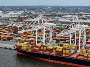 A drone view shows containers on a ship on the day U.S. President Donald Trump is set to announce new tariffs, at the Port of Baltimore, Maryland, U.S., April 2, 2025. REUTERS/Evelyn Hockstein