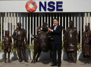 CEO of LG Electronics William Cho poses with the statue of the National Stock Exchange (NSE) bull, ahead of the listing ceremony of LG Electronics India Limited’s Initial Public Offering (IPO) at NSE in Mumbai, India, October 14, 2025. REUTERS/Francis Mascarenhas