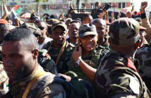 Colonel Michael Randrianirina speaks on the phone, as he arrives with military personnel to join protesters gathered outside the town hall on Independence Avenue during a nationwide youth-led demonstration against frequent power outages and water shortages, in Antananarivo, Madagascar, October 14, 2025. REUTERS/Siphiwe Sibeko