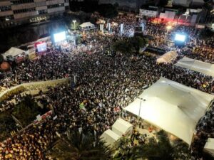A drone photo of people gathering in “Hostages square”, after a ceasefire between Israel and Hamas in Gaza went into effect, in Tel Aviv, Israel, October 11, 2025. REUTERS/Aviv Atlas TPX IMAGES OF THE DAY