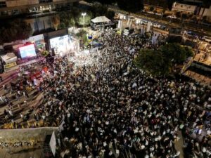 A drone photo of people gathering after Simchat Torah, which marks the final reading of the Torah, on the day the bodies of deceased hostages kidnapped during the deadly October 7, 2023 attack by Hamas are brought to Israel, at Hostages Square, in Tel Aviv, Israel October 14, 2025. REUTERS/Ilan Rosenberg