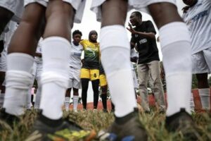 Model Queens Football Academy coach Muyhideen Abdulwahab, 27, talks to his team before the Youth Tournament final match with Kwara Ladies FC in Ilorin, Kwara State, Nigeria, August 29, 2025. In central Nigeria’s Muslim-majority state of Kwara, where religious traditions shape daily life, a group of girls are challenging cultural norms by playing soccer. REUTERS/Sodiq Adelakun