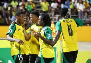Jugadores de Jamaica celebran uno de los cuatro goles con los que ganaron a Bermuda en la eliminatoria de la Concacaf. Estadio Independencia Park, Kingston, Jamaica. 14 de octubre de 2025.