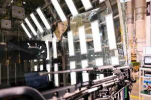 An employee inspects the cabin of a trailer truck at Scania’s production line in Rugao, Jiangsu Province, China, October 15, 2025. REUTERS/Go Nakamura