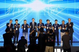 Scania employees and executives pose during the inauguration ceremony of Scania’s production line in Rugao, Jiangsu Province, China, October 15, 2025. REUTERS/Go Nakamura