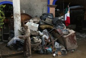 Una vista de escombros acumulados, incluidos muebles cubiertos de barro, con una bandera mexicana encima después de las lluvias torrenciales, en Poza Rica, México. 15 de octubre de 2025. REUTERS/Henry Romero