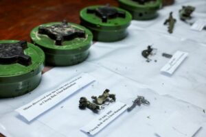 Shrapnel of a PMN-2 mine that Thailand says was exploded and recovered after the first incident on July 16 near a forested disputed border between Thailand and Cambodia in the Chong Bok area that severed a Thai soldier’s left ankle while he was on patrol, are displayed with other PMN-2 mines, in Surin province, Thailand, August 26, 2025. REUTERS/Chalinee Thirasupa
