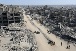 Palestinians walk past the rubble of destroyed buildings, amid a ceasefire between Israel and Hamas, in Gaza City, October 16, 2025. REUTERS/Dawoud Abu Alkas
