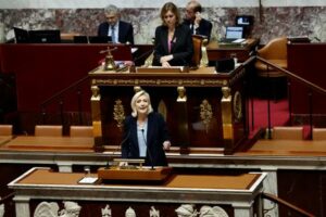 French far-right leader and member of parliament Marine Le Pen, President of the French far-right National Rally (Rassemblement National – RN) party parliamentary group, delivers a speech during a debate before votes on two no-confidence motions against the French government tabled by members of parliament of La France Insoumise (France Unbowed – LFI) and the Rassemblement National (National Rally – RN), two days after the French Prime Minister’s general policy speech, during a public session at the National Assembly in Paris, France, October 16, 2025. REUTERS/Benoit Tessier