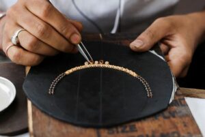 A goldsmith works on a gold necklace at a workshop in Ahmedabad, India, October 8, 2025. REUTERS/Amit Dave
