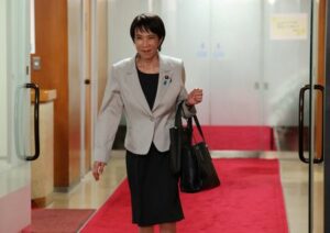Leader of Japan’s ruling LDP Sanae Takaichi leaves after a meeting with