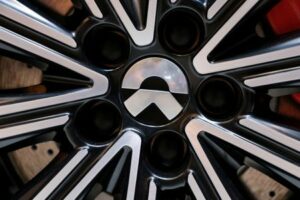 FILE PHOTO: A NIO logo is pictured at the NIO booth during a media day at the Auto Shanghai show in Shanghai, China, April 24, 2025. REUTERS/Go Nakamura/File Photo