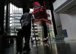 A man looks at a screen showing the Nikkei share average inside a financial building in Tokyo, Japan, September 18, 2025. REUTERS/Kim Kyung-Hoon