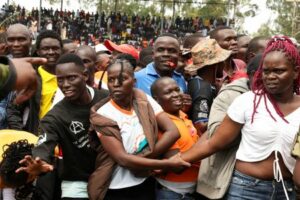Mourners react as security tries to contain the crowd lining up to view the coffin of Kenya’s former Prime Minister Raila Odinga during his funeral service at the Jomo Kenyatta Stadium in Mamboleo, in Kisumu County, Kenya, October 18, 2025. REUTERS/Monicah Mwangi