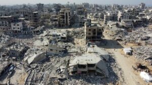 A drone view shows the destruction in a residential neighbourhood, amid a ceasefire between Israel and Hamas in Gaza, in Gaza City, October 19, 2025. REUTERS/Dawoud Abu Alkas