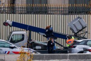 Police officers work at a crane believed to have been used in what the French Interior Ministry said was a robbery at the Louvre museum during which jewellery was stolen, in Paris, France, October 19, 2025. REUTERS/Gonzalo Fuentes