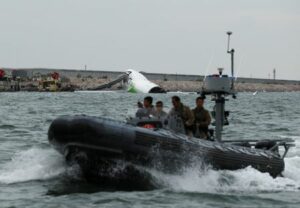 Emergency personnel work near a cargo plane lying partially in the sea after veering off the runway during landing at Hong Kong International Airport in Hong Kong, China, October 20, 2025. REUTERS/Tyrone Siu